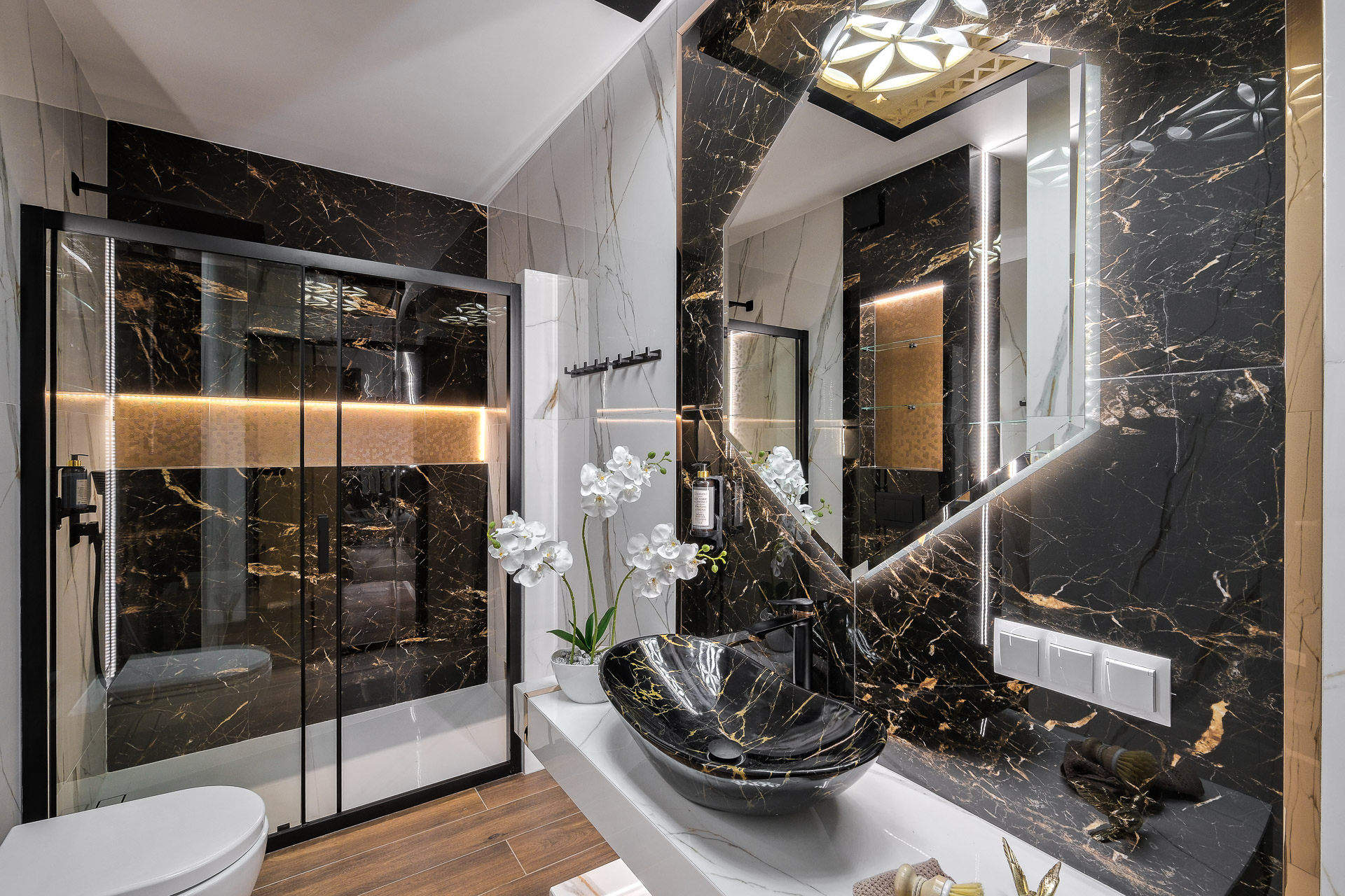 • Łazienka – prysznic walk-in w czarnej ramie, podwieszane WC, umywalka nablatowa, podświetlane lustro, czarny grzejnik drabinkowy, płytki o wyglądzie marmuru
