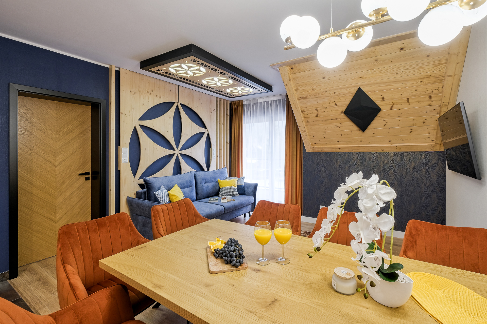 • Strefa dzienna / salon – sofa w kolorze miodowym, dekoracyjny panel ścienny z motywem koła, telewizor, duże okna z zasłonami i firanami, dywan