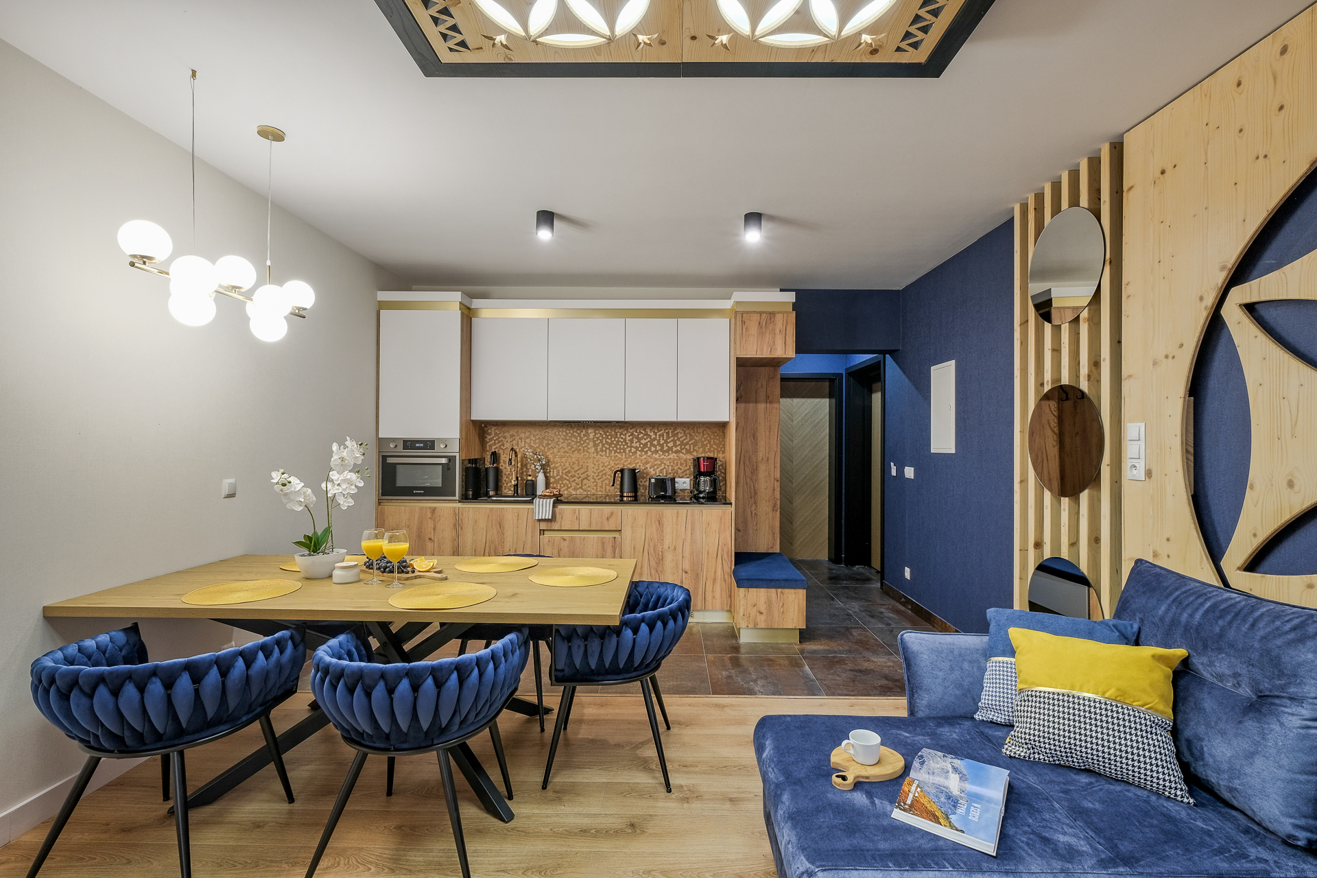 Część jadalniana – drewniany stół, sześć granatowych krzeseł, lampa sufitowa w złotej oprawie